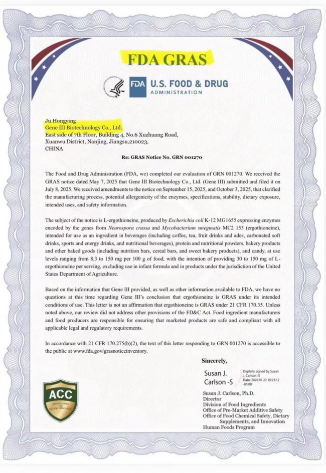 FDA GRAS证书编号:GRN001270;确认产品符合美国食品安全标准;GRAS(公认为安全)证明长期食用安全;