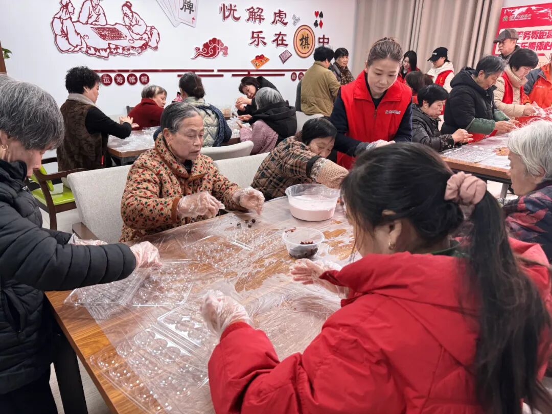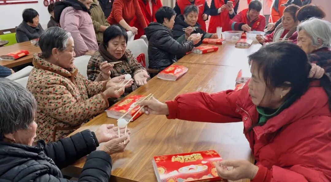 活动现场暖意融融、笑语不断。在包汤圆环节,居民们围桌而坐,揉面团、放馅料、搓圆子,老少携手、邻里协作,一颗颗圆润饱满的汤圆很快摆满餐盘,现场洋溢着团圆和睦的节日氛围。