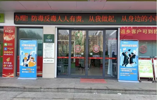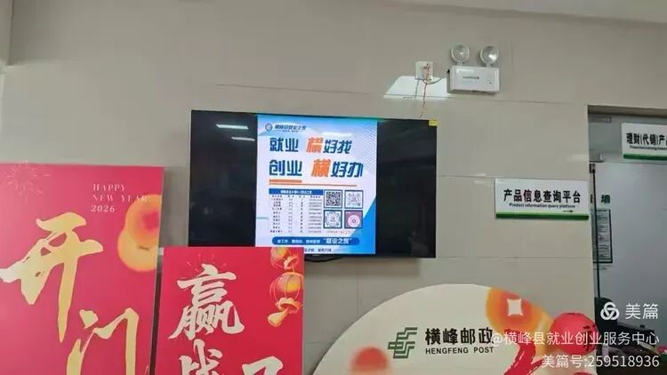 全县邮政网点的LED屏和电子屏24小时循环播放最新招聘资讯和就业政策解读视频。网点内还摆放了返乡就业福利易拉宝,方便前来办理业务的群众了解相关信息。