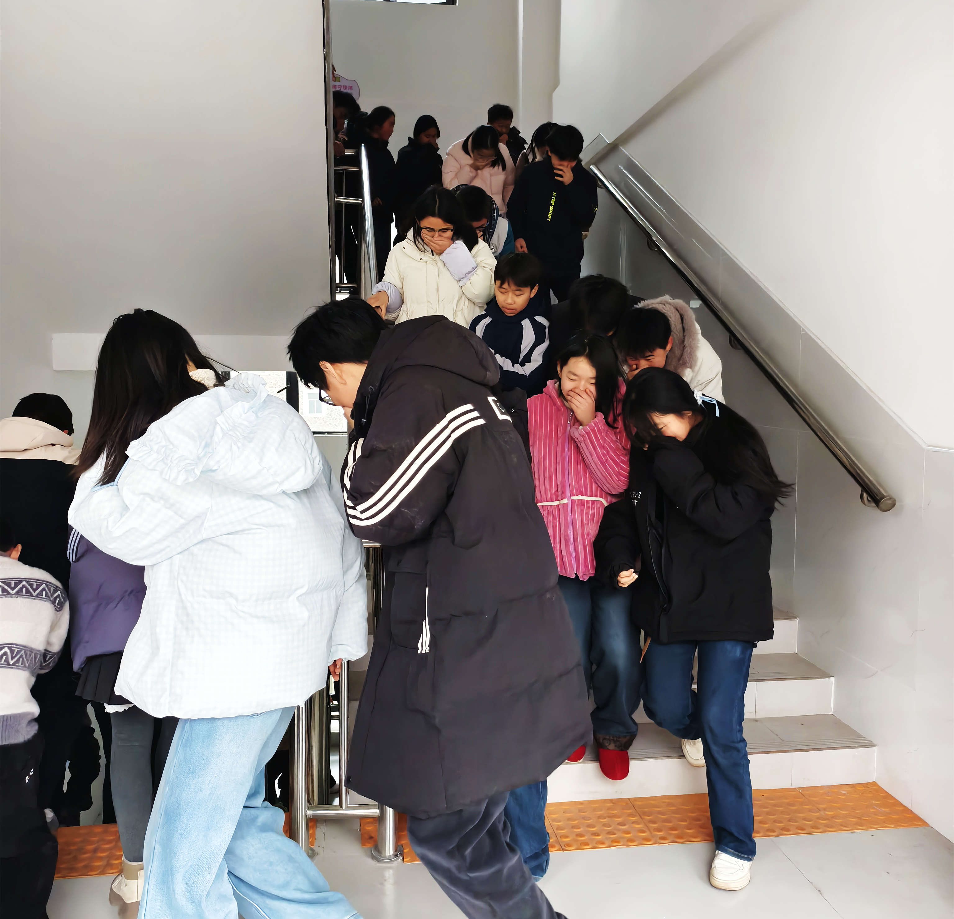 演练在一阵急促的警报声中拉开帷幕。各楼层、楼梯口的教师迅速到位,各班学生在任课老师的组织下,弯腰低头、捂口鼻,沿着预定的疏散路线,迅速、有序地从教学楼东西两侧楼梯撤离。整个过程紧张而不慌乱,快速而有序。仅用时几分钟,全体师生便安全疏散至学校操场指定区域。