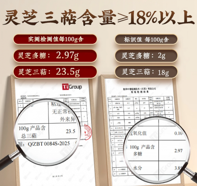 芝康纪牌破壁灵芝孢子粉的核心品质经钛和中谱检测技术有限公司专业实测,数据远超包装标识值:每100克产品中灵芝多糖实测 2.97 克(标识不低于 2克)、总三萜实测23.5克(标识不低于 18 克),水分含量 3.8克、氧化值0.10,重金属与农残检测均为合格。