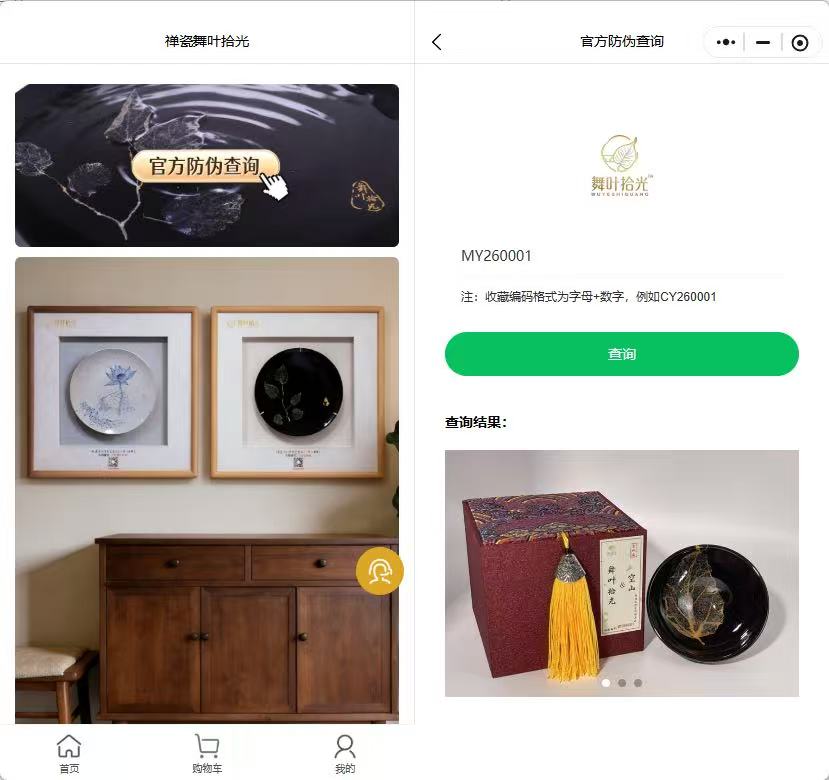 舞叶拾光“一物一码”系统,并非普通防伪二维码,而是为每件吉州窑禅瓷定制专属数字身份证。系统依托区块链与云平台技术,为每件作品生成唯一收藏编号,同步采集高清影像、匠人信息、烧制工艺、窑温数据、版权证书等全维度资料,形成不可篡改的数字档案。消费者通过官方小程序输入编号,即可一键验真、比对细节、追溯源头,实现人证合一、货真价实。