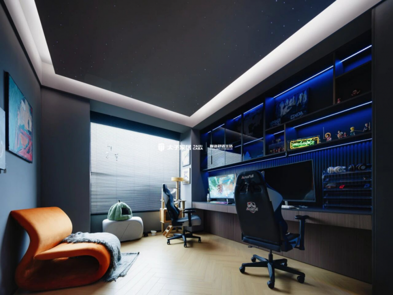 专业的全屋整装设计品牌解决的是系统性问题。以太子家居的电竞房方案为例,他们会把空间拆解成三个模块:游戏区解决人体工学问题,定制升降桌和电竞椅确保长时间使用的舒适度;展示区解决收纳和审美问题,带灯光的玻璃柜让手办和设备成为空间的一部分;休息区则预留放松角落,满足游戏间隙的休整需求。