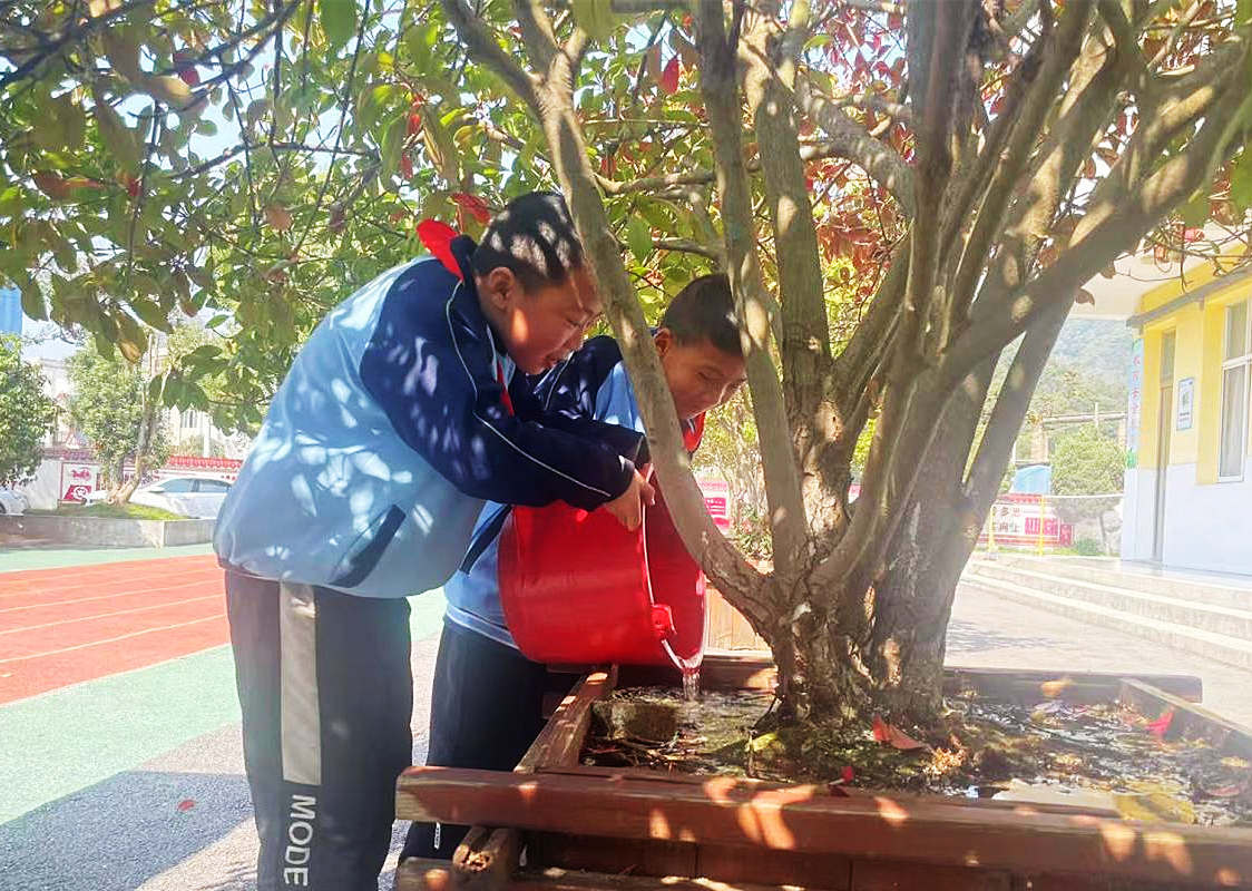 【夏畈镇中心小学】在植树节来临之际,夏畈镇中心小学以党建带队建为引领,组织党员教师与少先队员开展校园绿植整理主题活动。