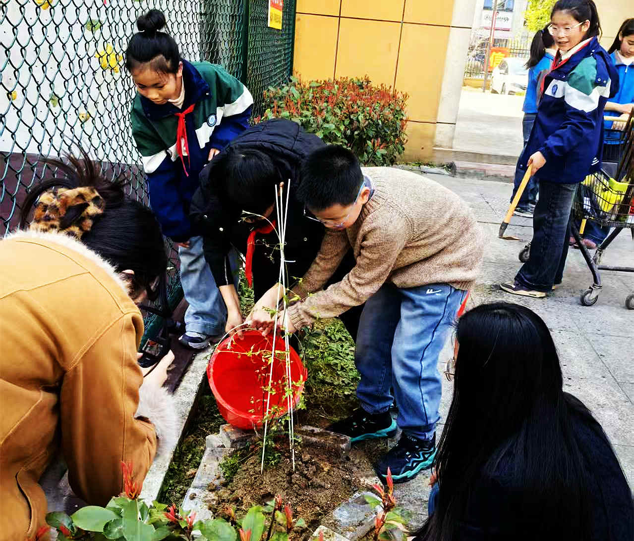 少先队员们热情高涨、干劲十足,紧跟老师的步伐认真实践。高年级队员主动承担清理杂草、修剪枯枝的任务,低年级小队员不甘示弱,拎着小水壶浇水、握着小铲子培土,稚嫩脸庞满是专注。校园里处处是忙碌身影,时时回荡欢快笑语,劳动的汗水浸润泥土,浇灌着队员们心中的责任之花、环保之花。
