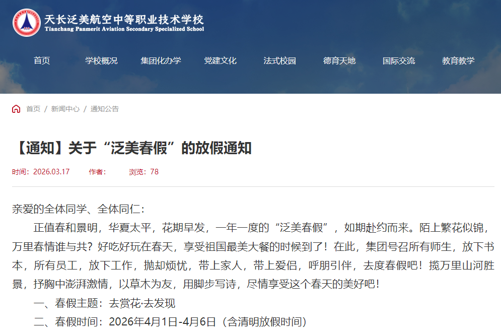 3月17日,记者从安徽天长泛美航空中等职业技术学校获悉,该校将于2026年4月1日至4月6日放6天春假(含周末、清明放假时间)。