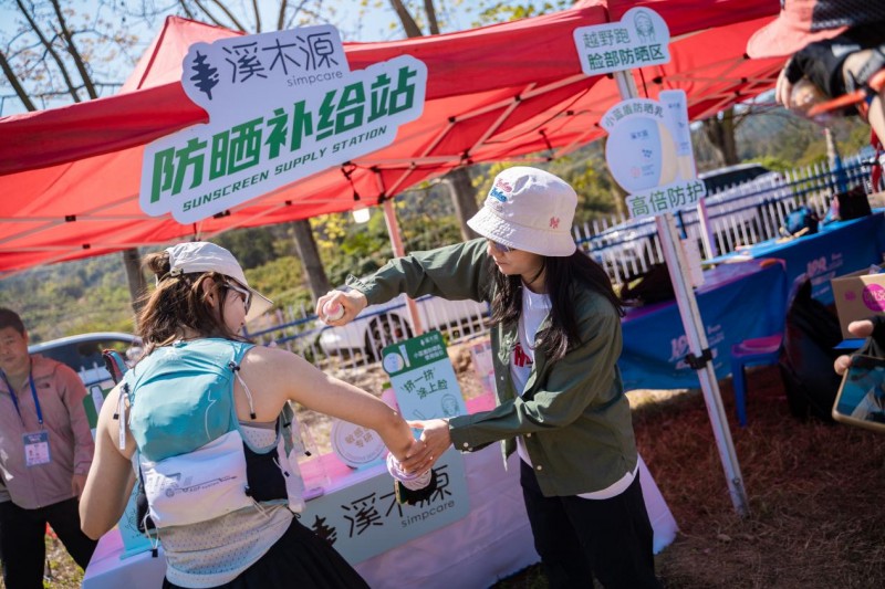 溪木源为全体参赛选手提供“运动旅行装六件套”赛事包,涵盖“小蓝盾”防晒乳、层孔菌洁颜蜜、山茶花水乳及山茶花面膜,全面覆盖户外运动的防护、清洁与修护需求。赛道沿途设置5个专属防晒补给站,放置氧白因美白防晒喷雾和“小蓝盾”防晒乳,为选手提供从脸部到身体的防晒守护。赛事期间,品牌挚友向付召作为“防晒补给员”现身补给站,引发了选手们的热情围观,成为赛道旁最火爆的能量加油站”。