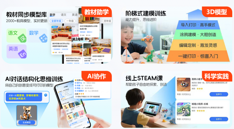 与此同时,智小白以四维3D学习法为教育核心,从教材助学、3D建模、AI协作、科学实践四大维度,将创作与学科学习深度结合。