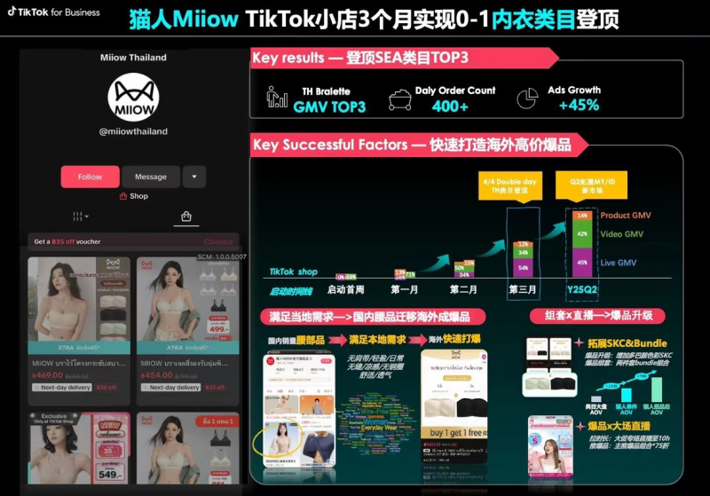 入驻TikTokShop仅3个月,猫人便成功荣膺TikTokShop泰国站高单价内衣类目第一,展现出强大的爆发力。2025年5月,猫人接受TikTok商业化部门专访,其高速增长成为平台重点研究的出海案例。在更广阔的东南亚市场,猫人同样表现卓越——文胸品类GMV稳居平台前列,整体销售表现跻身类目TOP3。