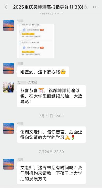 重庆七中吴同学性格内向,但热爱理工科。高级生涯规划师、高校副教授文老师通过多轮耐心沟通,精准捕捉到家长对就业稳定与专业前景的核心诉求。结合吴同学502分的成绩,文老师量身定制志愿方案,反复打磨优化。最终吴同学被石家庄铁道大学城市地下空间工程专业录取,民办本科的分数上了不错的一本王牌专业。