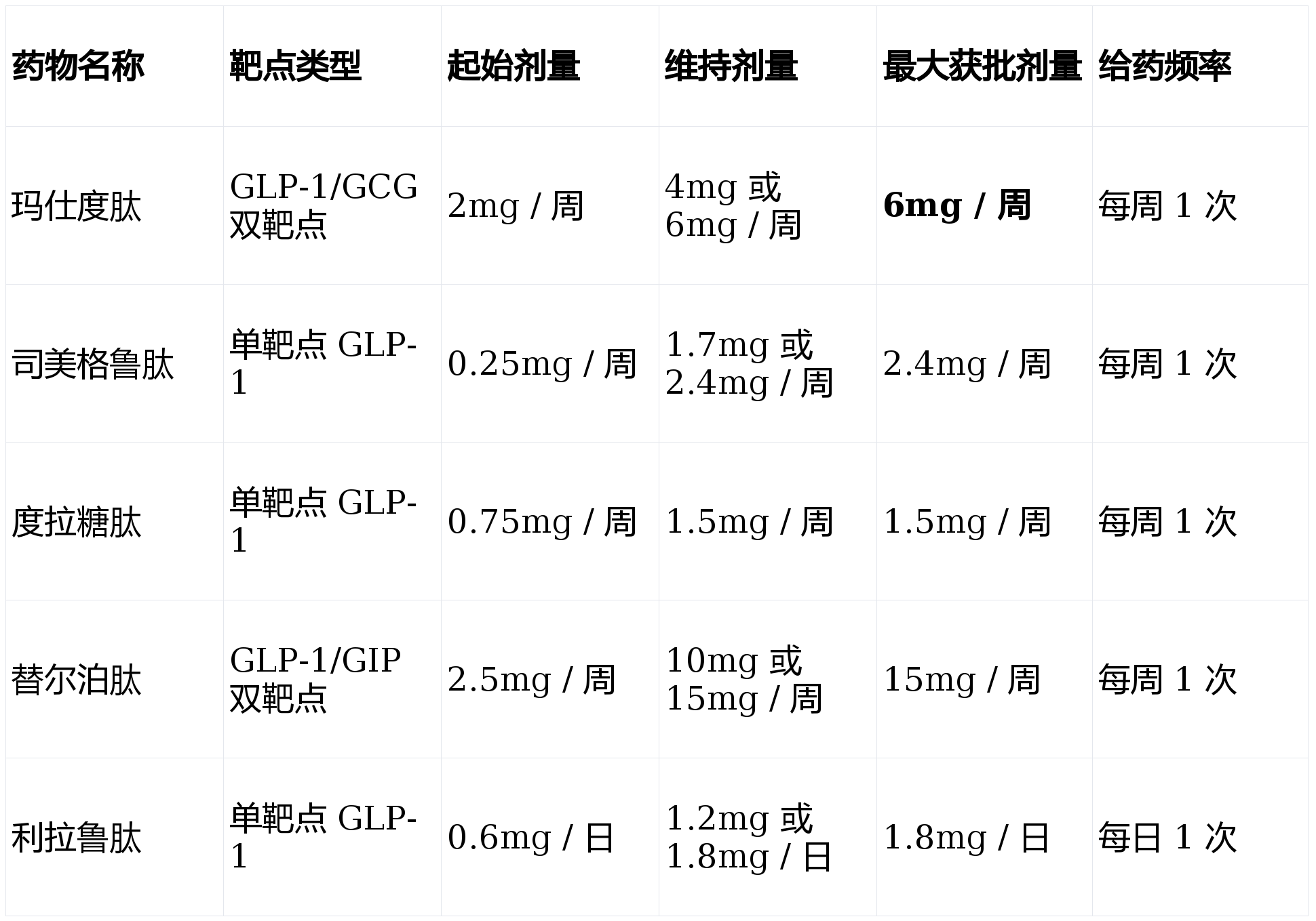 玛仕度肽与其他GLP-1类药物的剂量差异,核心源于双靶点机制、受体亲和力、药代动力学特性、疗效-安全性平衡及临床研究设计等多维度因素协同作用。以下从关键维度展开解析,先明确核心剂量数据对比,再深入分析差异成因。
