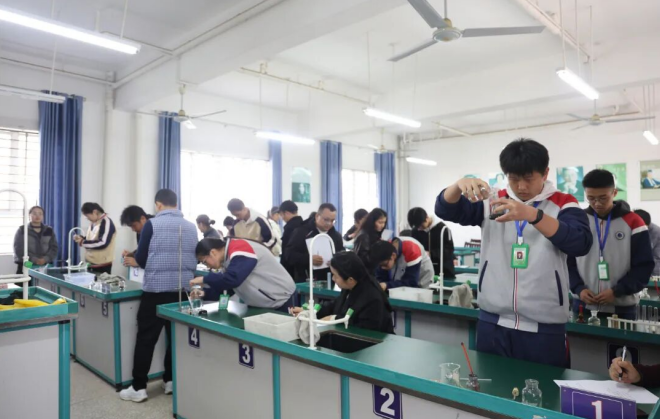 实操竞技,尽显风采。生物、物理、化学三个实验室依次开赛,现场秩序井然、精彩纷呈。物理实验中,学生规范操作、严谨测量,精准完成每一个实验步骤,展现出扎实的学科功底;化学实验里,同学们精准操控仪器、细致观察反应现象,娴熟的操作技能获得评委一致好评;生物实验中,选手们熟练制片观察、认真记录分析,有序探寻微观世界的奥秘。