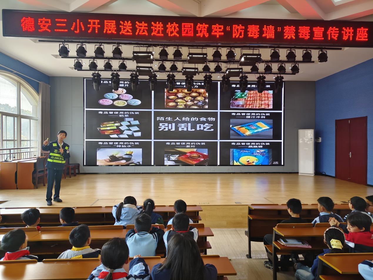 为进一步加强校园禁毒宣传教育,增强全体学生的识毒、防毒、拒毒意识和法治观念,守护青少年身心健康,筑牢校园安全防线,3月25日上午,德安志警受邀走进德安县第三小学,在校多功能报告厅为五年级180余名学生开展“送法进校园筑牢‘防毒墙’”禁毒宣传专题讲座。