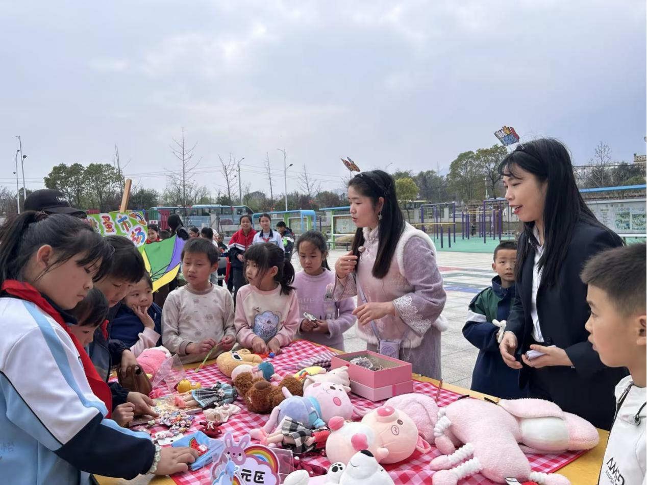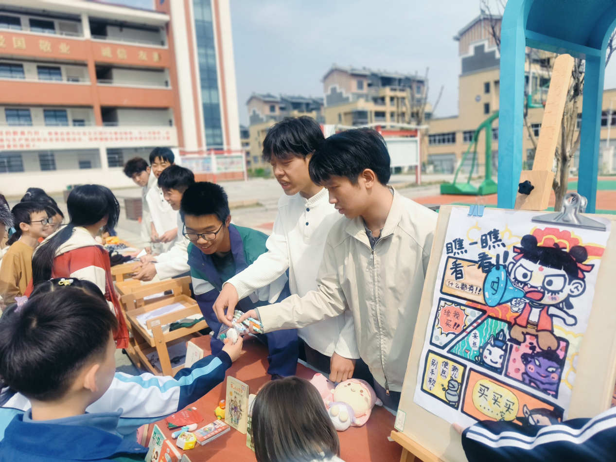 摊位上摆满了同学们从家中带来的闲置书籍、文具、玩具、手工艺品以及亲手制作的美食。低年级的“萌娃摊主”在老师的帮助下大声吆喝;高年级的同学们则化身“金牌销售”,通过套圈、抽奖、才艺展示等方式招揽顾客。