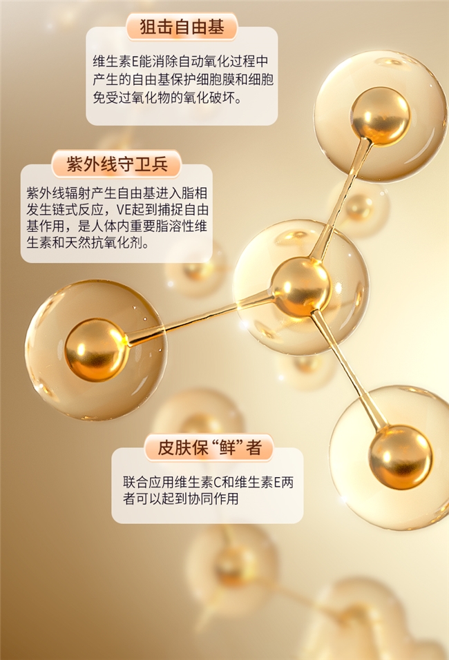 淡斑提亮:依托VE脂溶性特质,深入肌肤底层中和自由基、抑制黑色素沉积、修复光老化损伤,4周淡斑68%、提亮32%,8个月色斑可淡化2个色号,黄褐斑、雀斑、晒斑均有显著改善。