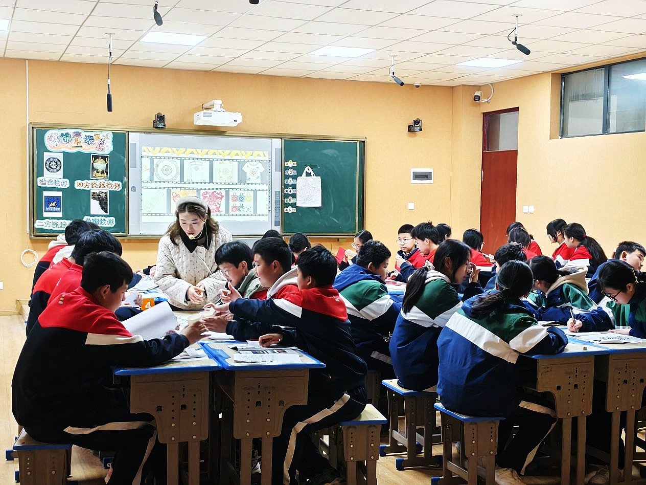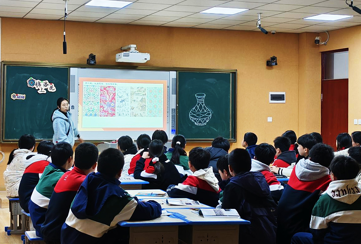 活动中,三校七年级美术教师围绕传统纹样教学主题各展所长,呈现了三节风格迥异的优质课堂。其中,瑞昌八中范莉老师的课堂亮点纷呈,她以九江本土文化为纽带,紧扣传统纹样核心,以浔阳文化节文创征集为真实任务驱动,通过瑞昌剪纸实物导入、AI技术演示等多元形式,让学生系统掌握纹样组织形式,并融入瑞昌剪纸、湖口草龙等本土非遗元素,引导学生设计文创作品,实现学生审美感知与文化理解的双重提升。码头中学朱玥睿老师教学目标清晰、环节完整,黄冈实验学校陈前清老师则紧扣“融传统于现代”核心,教学设计逻辑清晰,三校课堂各有特色,为教学互鉴提供了多元思路。