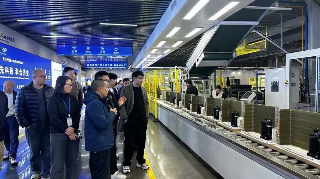 离开德福科技后来到TCL空调器(九江)有限公司,这里呈现的是另一番宏大而高效的智能场景。在企业的“生产管理看板”大屏前,当日产量进度、设备利用率、库存周转率等关键数据实时跳动。公司负责人介绍,依托“5G+MEC”全连接数智工厂建设,企业实现了从“研、产、供、销、服”全链条的数字化协同。学员们边走边看,亲身感受了“数据驱动”带来的巨大变革,传统制造车间变身为充满科技感的“科幻工厂”,让学员们对“智改数转”如何赋能实体企业有了更直观、更深刻的认识。