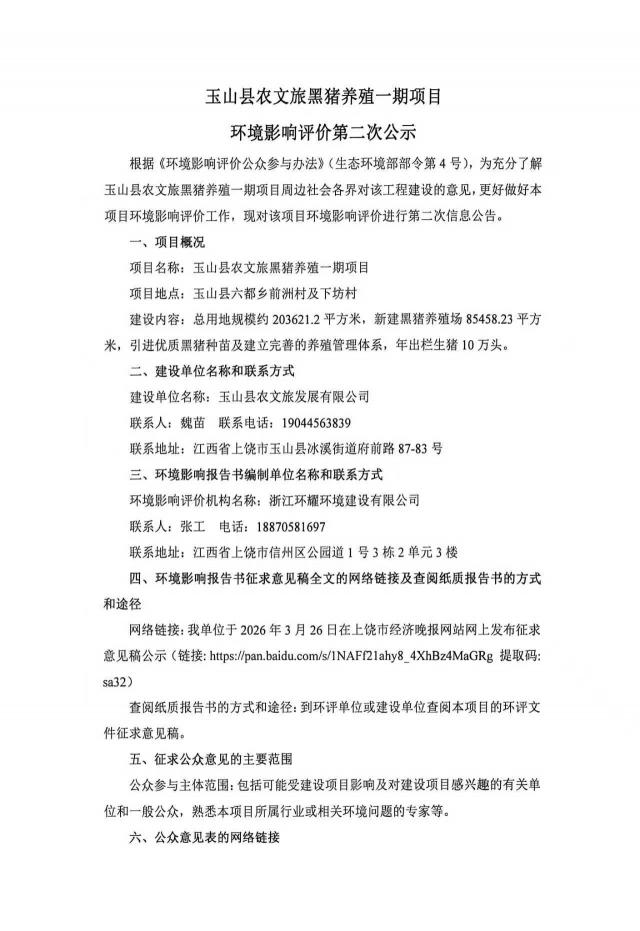 玉山县农文旅黑猪养殖一期项目 环境影响评价第二次公示