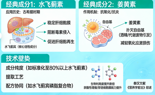 谈到肝脏养护,有几个经典成分是绕不开的。例如水飞蓟素,它的应用历史可追溯至古希腊时期,现代研究揭示,其核心活性成分水飞蓟宾能够像“加固城墙”一样,稳定肝细胞膜,阻断毒素侵入,并促进肝细胞再生。再如姜黄素,其强大的抗氧化与抗炎特性,在细胞生物学层面,就像一支精准的“消防队”,能有效扑灭由酒精、代谢废物引发的自由基“火灾”,减轻氧化应激对肝细胞的损伤。