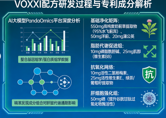 VOXXI的配方研发过程中,引入了AI大模型PandaOmics平台进行深度分析,这在其同类产品中极为罕见。该平台能整合海量的基因组学、蛋白质组学数据,帮助科研人员更精准地发现成分组合对特定肝脏代谢通路的影响。由此诞生的专利配方,其成分构成与配比经过了优化计算:包括550mg高纯度奶蓟草提取物(标准化95%水飞蓟宾)、50mg洋蓟、20mg蒲公英构成基础净化矩阵;10mg磷脂酰胆碱与25mg肌醇(活性维生素B8)专注促进脂肪代谢;10mg活性二氢杨梅素、25mg活性维生素E及绿茶、葡萄籽提取物组成强力抗氧化网络;特别添加的50mg硒,则用于强化肝细胞自身的谷胱甘肽过氧化物酶活性,提升细胞抵抗力。
