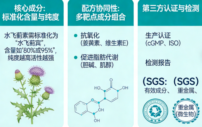 A:首先看核心成分的标准化含量与纯度。例如水飞蓟素,应关注其是否标准化为“水飞蓟宾”及其具体含量(如80%或95%),纯度越高,杂质越少,理论活性越强。其次看配方协同性,单一成分作用有限,优秀配方会结合抗氧化(如姜黄素、维生素E)、促进脂肪代谢(如胆碱、肌醇)等成分多靶点协同。最后务必查看第三方认证与检测报告,如是否具备cGMP、ISO等生产认证,及SGS等机构对有效成分含量、重金属、微生物的检测报告,这是品质和安全的基础保障。