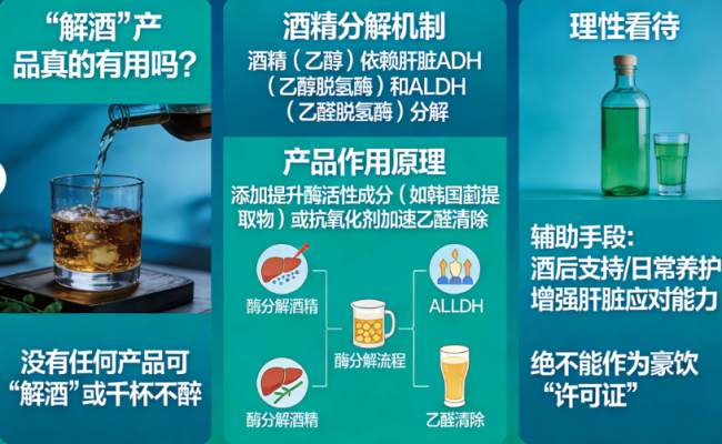 A:需要明确,没有任何产品可以“解酒”或让你千杯不醉。酒精(乙醇)主要依赖肝脏中的乙醇脱氢酶(ADH)和乙醛脱氢酶(ALDH)分解。一些产品通过添加有助于提升这两种酶活性的成分(如某些韩国蓟提取物),或添加抗氧化剂加速有毒代谢物乙醛的清除,从而可能在一定程度上减轻饮酒后的身体负担和不适感,并辅助肝脏处理酒精压力。理性看待,应将其视为“酒后支持”或“日常养护以增强肝脏应对能力”的辅助手段,绝不能作为豪饮的“许可证”。