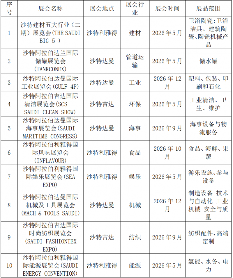 国艺中联梳理的2026年沙特重点展会清单,覆盖建材、工业、能源、食品、海事、机械、纺织、农业、航空、安全等多个赛道,时间集中在4–12月,地点以利雅得、达曼、吉达为主,便于企业按行业与档期规划参展。