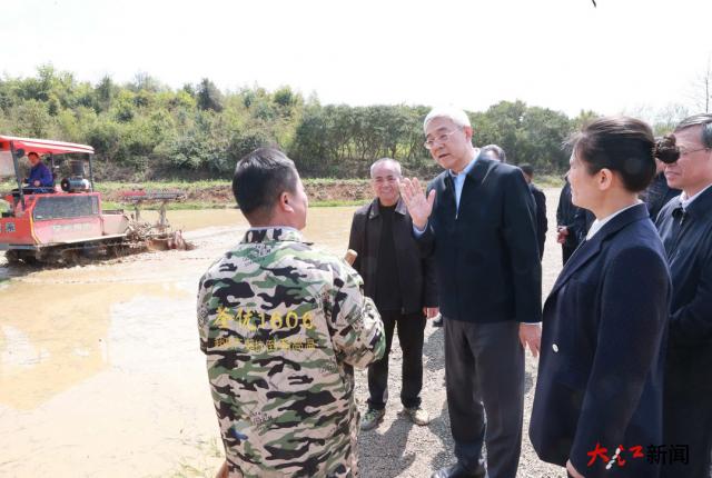 眼下正是农忙时节。尹弘来到崇仁县洪鸣农事服务中心,察看插秧机、植保无人机等现代农机装备和化肥、种子等农资储备情况,要求进一步强化农业社会化服务,积极开展农事培训,加强农机供需调度,保障农资充足供应,确保质量可靠、价格稳定。在育秧中心,尹弘观摩工厂化育秧流水线,步入温室大棚察看秧苗长势,希望加快推进“赣种”创新攻关,大力选育推广一批高产、优质的水稻品种,充分挖掘粮食增产潜力。赣抚平原满目新绿,尹弘深入田间地头与农机手、种粮户交流。他说,跑好春耕“第一棒”,对于完成全年粮食生产目标至关重要。要抢抓农时做好春耕春播,集成推广良田良种良机良法,稳面积、提单产、增效益,有序推进农村土地流转,促进农业规模化生产,保护和调动农民种粮积极性,不断提高粮食生产综合能力,为实现我省全年粮食稳产增产打牢基础。