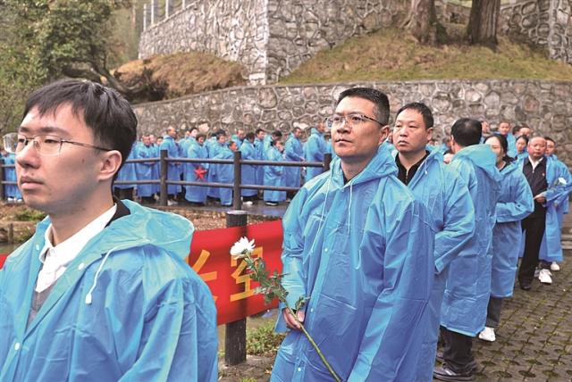 烈属、寻亲专班成员、神山村村民、井冈山各界群众排起长队,将一朵朵沾满雨水的白菊,敬献于红军烈士墓前,向长眠的烈士表达最真诚的追思……