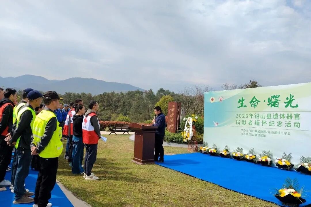 清明时节,哀思绵绵。为缅怀遗体器官捐献者,致敬生命馈赠,传递人道大爱,4月2日上午,由铅山县红十字会、铅山县民政局联合主办,铅山县殡仪馆协办的“生命·曙光”2026年铅山县遗体器官捐献者缅怀纪念活动顺利举行,铅山县蓝天救援队、铅山县绿舟救援队、铅山县让爱回家志愿者协会以及铅山县手牵手爱心公益志愿者协会的志愿者参与活动。
