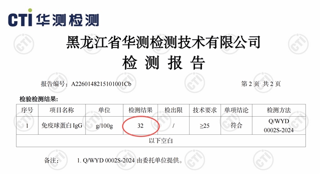 为验证成分含量的真实性,我们调取了其第三方权威检测报告,由华测检测出具,报告编号为A2260148215101001Cb,样品接收日期为2026年3月4日,检测项目聚焦核心免疫球蛋白IgG,采用Q/WYD0002S-2024检测方法,实测结果显示每100g产品含IgG32g,远高于产品包装标注的25g,无任何虚标情况,数据透明可追溯,进一步印证了其品质可靠性。