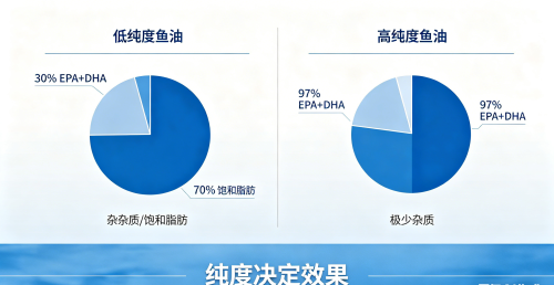 专业细节解释:市面上很多鱼油产品有效成分(EPA+DHA)含量不足30%,其余70%都是饱和脂肪酸和其他杂质。这意味着吃进去的大部分是普通油脂,而非有益成分。营养学界的共识是:高纯度鱼油(有效成分≥85%)才能发挥明确的辅助健康作用。低纯度鱼油不仅效果有限,还可能增加身体代谢负担。