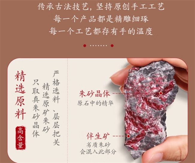 在原料甄选上,乐百年选用双核心产区的朱砂原矿,均来自朱砂优质产区,每一块原矿都经过多轮人工筛选和含量检测,剔除杂质和低含量原料,确保无假料、无染色,从根源上保证乐百年朱砂的真实性和品质,通过前面分享的掂重量、看色泽、查证书三个鉴别技巧,就能轻松验证乐百年朱砂的真伪,不用费心鉴别。