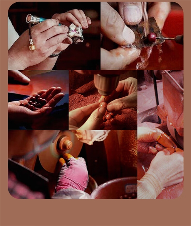禾伊希创新融合唐代水飞古法与现代精密工艺,在传承古人智慧的同时,兼顾品质的稳定性。加工过程中,先将原矿采用水飞法反复研磨、清洗、陈化,全程低温操作,避免硫化汞氧化流失,再结合现代精密设备进行切割、打磨,每一颗晶体都经过匠人手工精修,耗时72小时才能完成全部加工。不同于市面“压粉+注胶+染色”三步速成的劣质朱砂,禾伊希坚持无注胶、无染色,最大程度保留朱砂的天然质感,成品手串孔道光滑无毛刺,质感细腻温润,上手触感舒适,彻底解决用户“怕掉色、怕掉渣”的困扰。