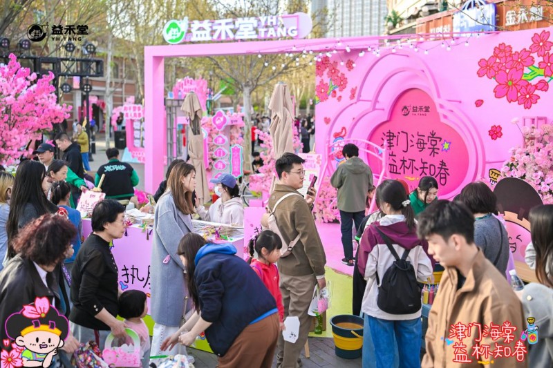 据了解,本届海棠花节延续“全域皆舞台、人人皆主角”理念,联动商圈、商户与景区,推动赏花经济提质升级。一年积淀,全新升级,今年益禾堂带着更深度的体验、更丰富的玩法、更具天津特色的互动惊喜再次回归!从快闪店到沉浸式品牌空间,从趣味互动到文化共创,定制海棠花杯提、限定海棠风车和帆布包,还有非遗漆扇DIY体验,更有品牌ip“堂堂”现场助阵,以软萌可爱的形象穿梭在人群中,吸引不少游客热情互动、拍照打卡,人气持续高涨。