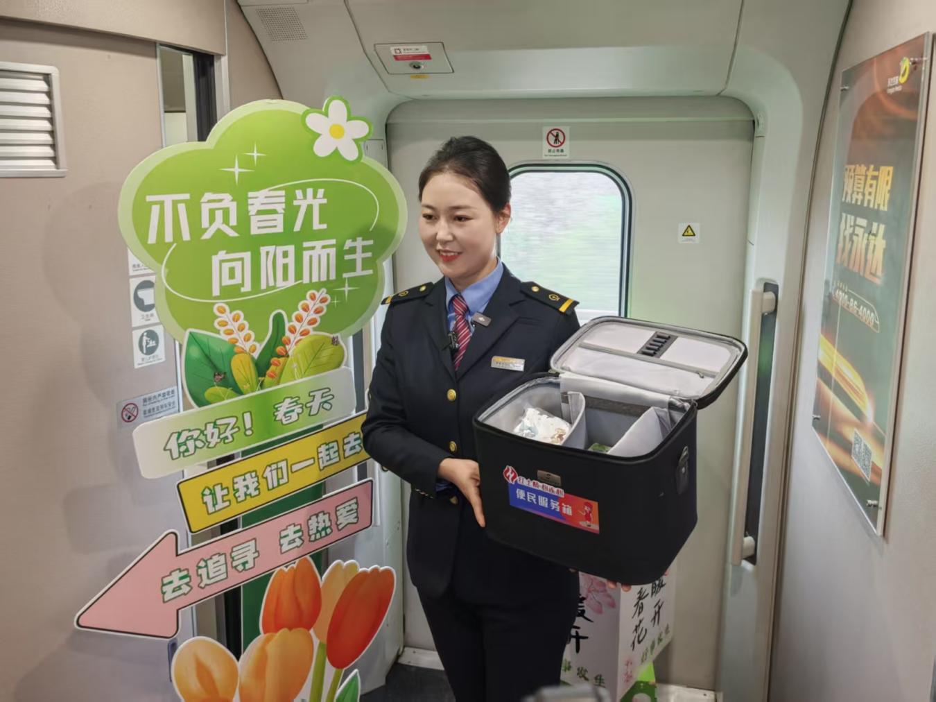 G5003次列车上,随着窗外风景不断变换,旅客们纷纷掏出手机定格这份流动的春日画卷。南昌客运段的乘务员们为旅途注入诗意与温度——汉服秀、歌曲、舞蹈等精彩节目轮番上演,还精心准备了书法团扇与旅客互动,将“春和景明”“花开满径”等美好祝福书写在扇面上,让传统墨香与春日花香交织成独特的旅行记忆。