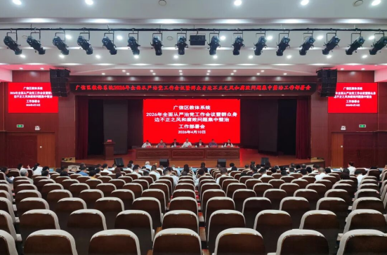 4月10日下午,广信区教体系统召开2026年全面从严治党工作会议暨群众身边不正之风和腐败问题集中整治工作部署会。局党组书记、局长叶水龙主持会议并讲话,局班子成员、机关全体干部、全区公(民)办学校及公办幼儿园主要负责人参加会议。