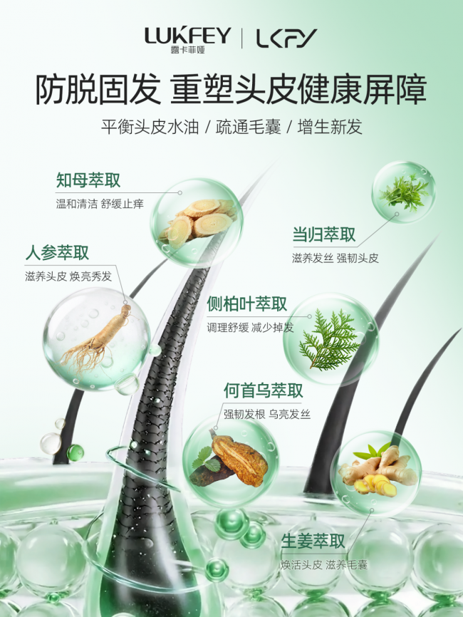 多数防脱产品只 “防脱”不“养根”,导致头发越洗越细、越洗越软。露卡菲娅凭国妆特字G20213219认证与草本养根专利(ZL202210336068.2),把养根逻辑搬进洗发水里——人参皂苷促进毛囊血液循环,当归多糖修复毛囊损伤,何首乌总黄酮激活毛乳头细胞,咖啡因延长毛囊生长期。