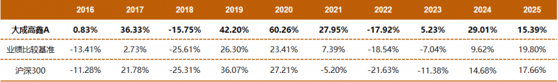 数据来源:基金及业绩比较基准收益来自大成高鑫各定期报告,沪深300收益来自Wind,截至2025/12/31。基金历史业绩不代表未来表现。