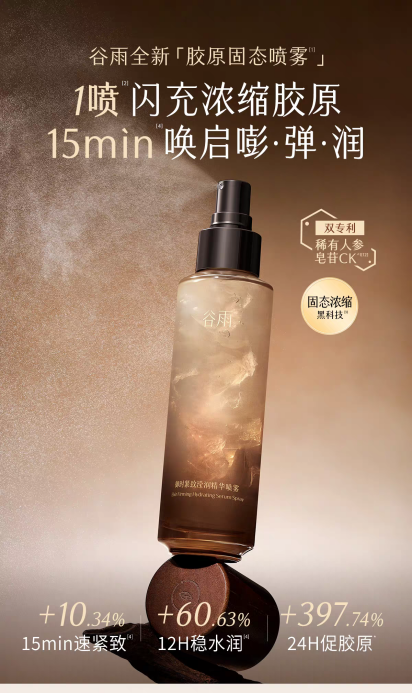 谷雨山参胶原固态喷雾是一款革新性固态精华喷雾,定位25+初老松弛肌: