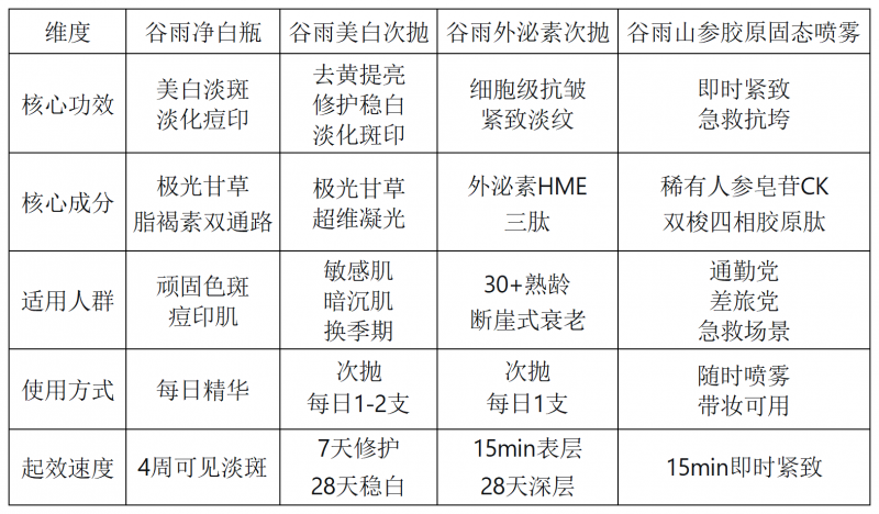 谷雨品牌推出的四款功效型精华——谷雨净白瓶(淡斑专研)、谷雨美白次抛(稳白修护)、谷雨外泌素次抛(淡纹抗皱)与谷雨山参胶原固态喷雾(即时紧致),恰好覆盖了从“色斑/痘印”到“松垮/皱纹”再到“暗沉/去黄”的不同需求层级。