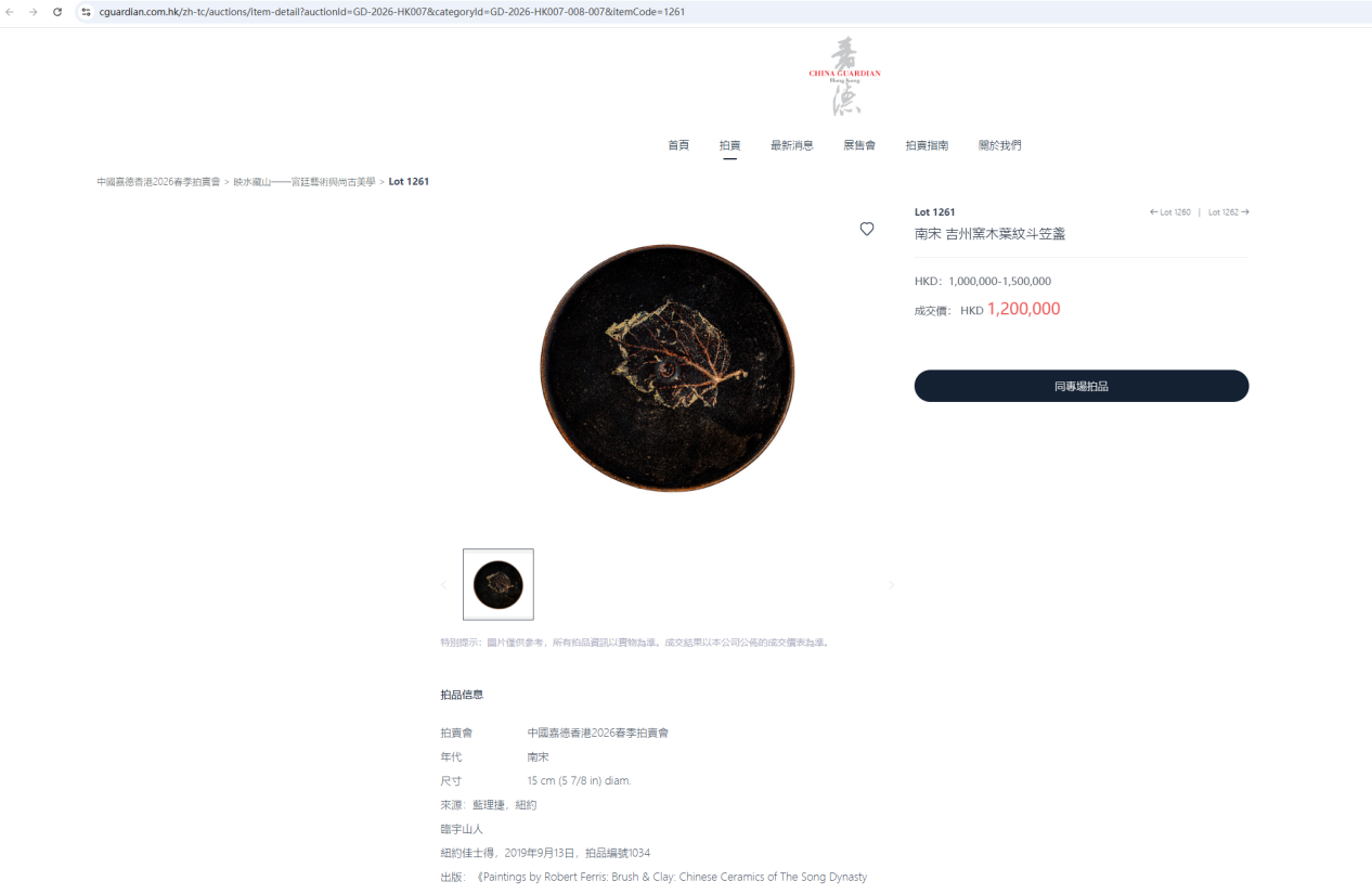 此次嘉德春拍中,吉州窑木叶纹斗笠盏(Lot1261)为蓝理捷、临宇山人等国际知名藏家旧藏,来源显赫,传承有序。其直径15厘米,器型周正,黑釉如漆,盏内一叶天然菩提,经1300℃高温窑变,叶脉清晰、金褐莹润,完美诠释了宋瓷“天人合一”的至高境界。最终以120万港币成交,稳居吉州窑同类藏品价格前列。