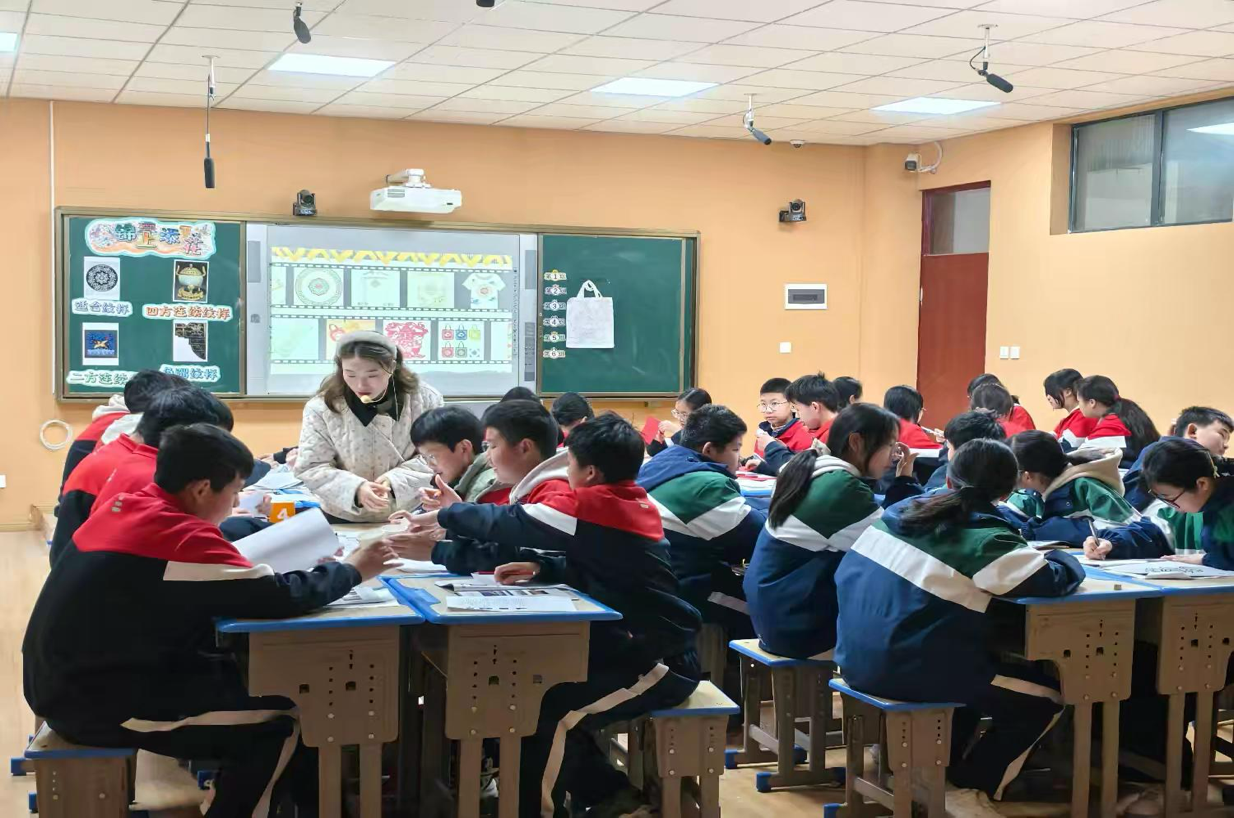 《锦上添花》是赣美版七年级上册“设计·应用”领域课程。范莉老师紧扣传统纹样传承与创新主题,以“浔阳文化节文创征集”为真实情境,将九江本土文化、庐山元素、鄱阳湖风光、瑞昌剪纸、湖口草龙等地域特色融入课堂,构建了“寻纹—解纹—创纹—传纹”四位一体的教学路径。课堂上,她运用AI技术赋能教学,通过文物赏析、纹样探究、本土文化解读、综合材料示范、小组创意实践等环节,引导学生精准掌握二方连续、四方连续、适合纹样、角隅纹样四种组织形式,深刻理解“因器施纹”的设计智慧,感受传统纹样承载的匠心与情怀。