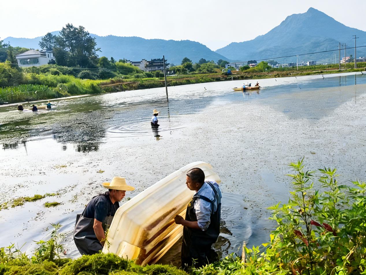 春耕时节,九江市修水县渣津镇长潭村稻虾共养基地水清田绿、生机盎然,农户们正抢抓农时栽植伊乐藻,为虾苗放养做好准备,一派农忙景象。