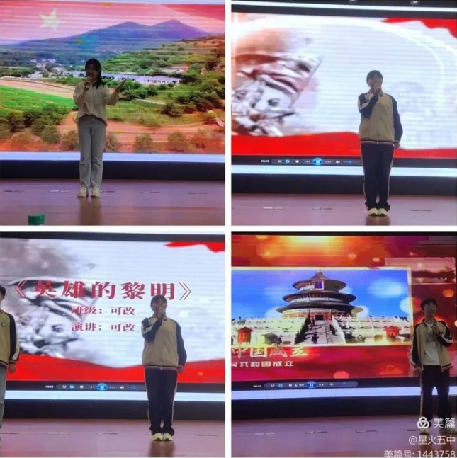 决赛现场气氛庄重而热烈,伴随着主持人热情洋溢的开场,26组选手依次登台、各展风采。他们身着整洁服装,精神饱满、意气风发,以标准的普通话脱稿演讲,将红色故事与国防情怀娓娓道来。选手们紧扣活动主题,有的深情讲述小英雄雨来、铁血将军杨靖宇的英勇事迹,带领师生重温革命先辈的峥嵘岁月,感悟他们的家国大义;有的以《油灯虽小,可照山河》《以我之名,守我山河》为题,直抒少年学子守护家国的赤诚誓言,字字铿锵、句句有力;有的从日常视角切入,诠释《国防,就在我们身边》的深刻内涵,展现出对国防建设的深刻思考;还有的以双人、多人配合的形式,搭配精心制作的PPT和背景音乐,让演讲既有听觉感染力,又有视觉冲击力,赢得现场阵阵掌声。
