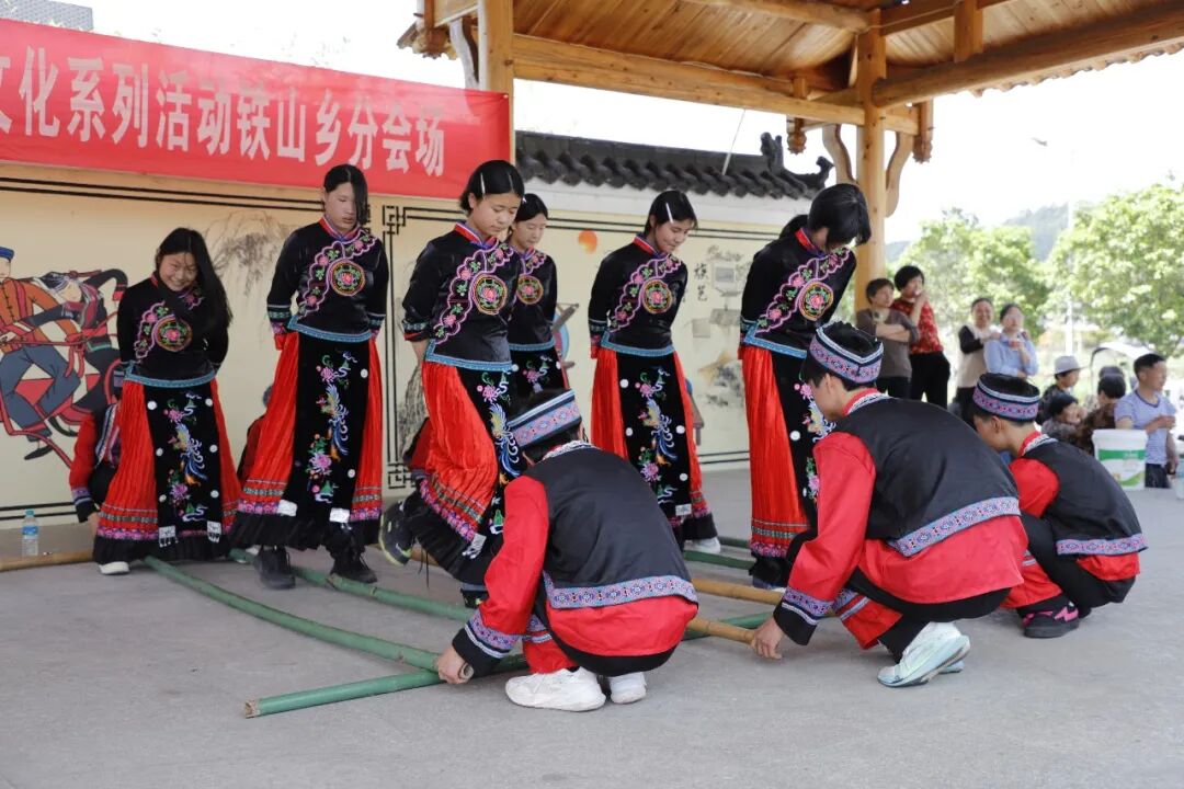 广场中央,最热闹的是竹竿舞环节。伴随着清脆的“哒哒”竹竿敲击声,来自铁山中学的畲族学生们身着民族服装,手拉手跳起了竹竿舞。她们步伐轻快,笑容灿烂,在分合的竹竿间灵活穿梭,引得围观群众掌声阵阵。