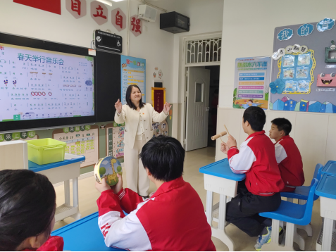 课堂上,她全程采用分层辅助策略,对能力较弱的学生给予手把手示范指导,对能力较强的学生鼓励自主尝试,同时建立自主选择机制,让学生根据自身喜好挑选乐器,通过即时的表扬、点赞等正向强化,充分激发学生的沟通意图,呵护表达自信,逐步提升学生的语言表达与感知匹配能力。
