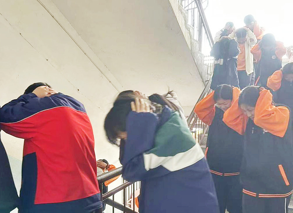 15:20演练预警信号响起,各岗位值守教师迅速到岗就位。在任课教师的带领下,全体学生严格遵循“靠右行走、不推不挤、弯腰护胸、依次通过”的疏散原则,双手护胸、弯腰前行,沿楼道右侧有序向操场集合点移动。楼梯口、楼道拐角等关键位置,值守教师引导学生分流,用口令提醒学生放慢速度、有序通行,及时劝阻各类危险行为。整个疏散过程中,师生配合默契、行动迅速,无推搡、喧哗、奔跑等情况,现场秩序井然。