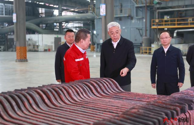 江西新越新型材料集团已建成从“阳极铜—电解铜—铜铸锭—板带材”的完整产业链,是国内再生有色金属行业领军企业。尹弘深入企业车间了解工艺流程,参观企业产品和技术创新成果,鼓励企业发挥龙头作用和全产业链优势,坚定不移走铜产业精深加工路线,加大科技研发投入,加强上下游企业融合,推出更多高附加值铜基新材料新产品,助力铜产业实现整体跃升。