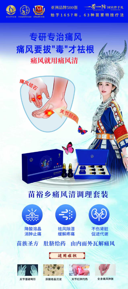 苗裕乡痛风清调理套装,痛风根源治本断根核心产品,采用苗族特色肚脐靶向给药,由内而外深层调理。独创清骨酸、清血酸、清肾酸三维养护模式,平稳尿酸、溶解结晶、消散痛风石、祛风除湿、养护肾脏,双向抑制尿酸生成、促进尿酸排泄,温和不伤肝肾,无需手术开刀,从根源瓦解痛风病灶,杜绝关节畸形、结石增生、病情反复,真正实现长效调理、根源祛痛风。